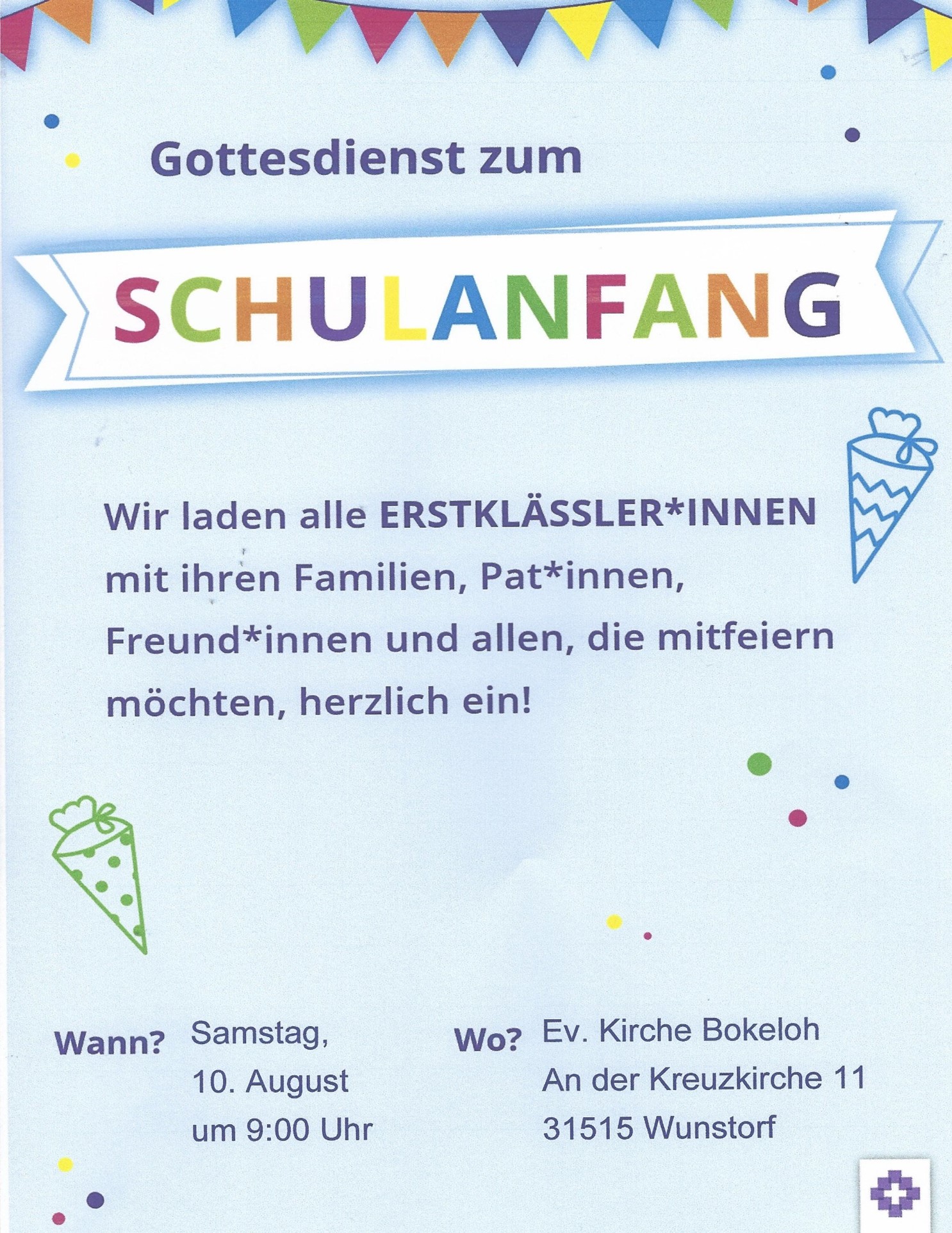 • 10. August 9 Uhr: Ökumenischer Einschulungs-Gottesdienst in Bokeloh