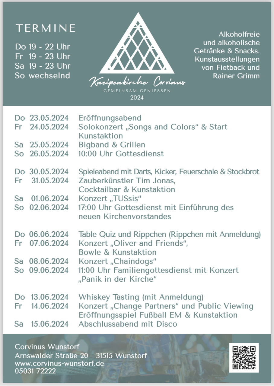 Besuchen Sie die diesjährige Kneipenkirche in der Corvinuskirche, Arnswalder Straße 20, 31515 Wunstorf! https://kneipenkirche.wir-e.de/aktuelles