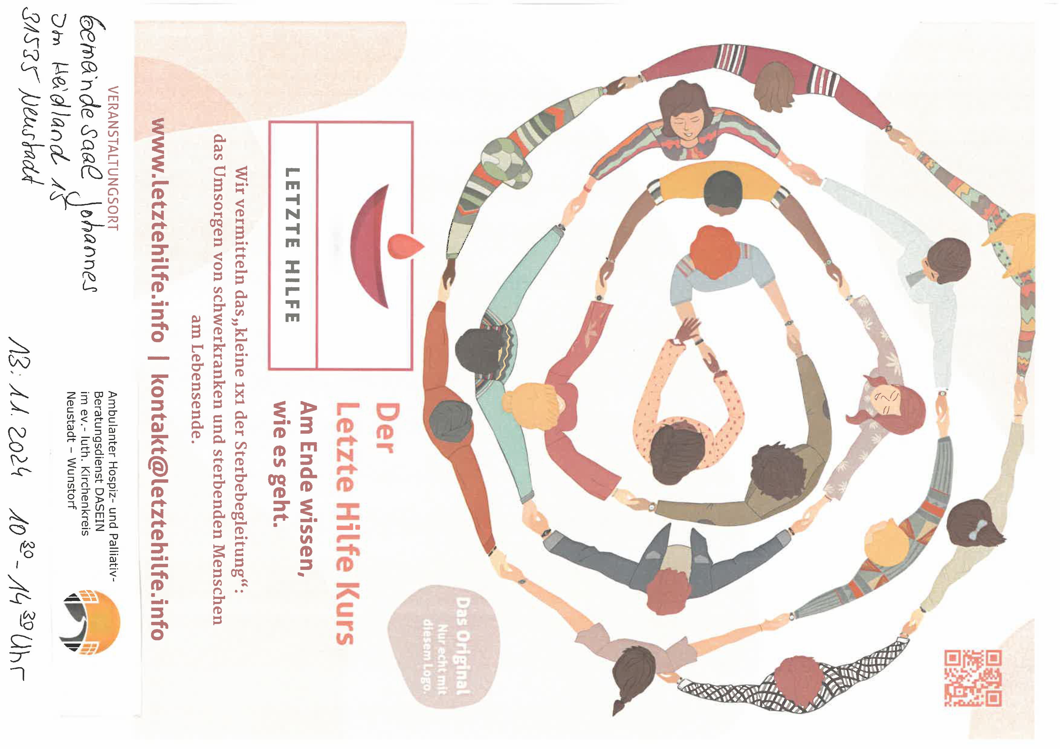 Rückfragen: Hospizdienst Dasein, Tel 05031 9490300, Arnswalder Str. 20, 31515 Wunstorf, E-Mail: hospizdienst.dasein@evlka.de www.hospiz-dasein.de